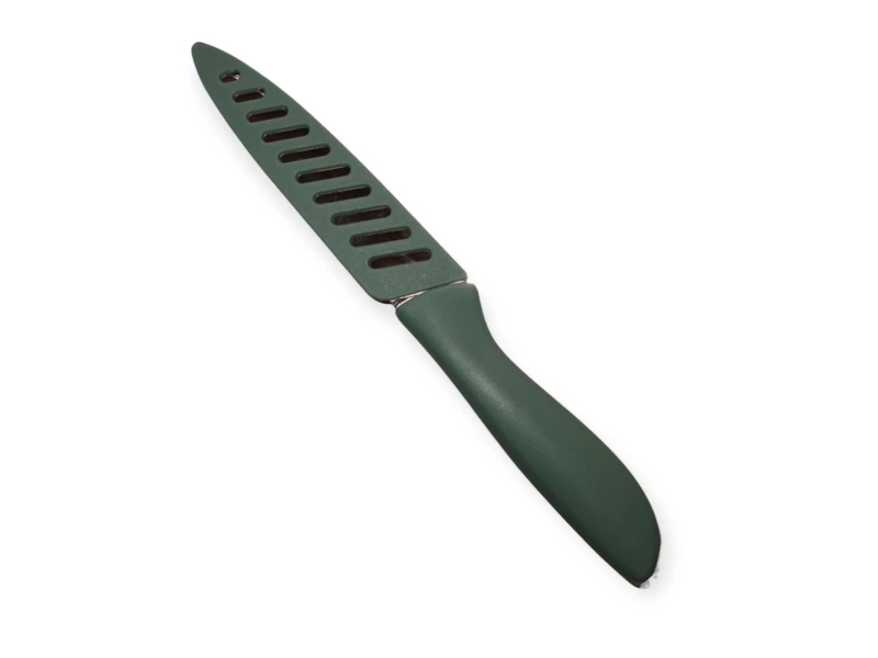 Кухонний ніж з матовою ручкою та накладкою на лезо - це ідеальний інструмент для любителів готувати, який поєднує в собі елегантний дизайн та чудові функціональні характеристики. З його допомогою ви зможете легко та швидко справлятися з підготовкою інгредієнтів, що значно спростить процес приготування страв.
