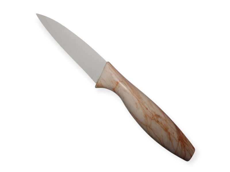Кухонный нож с белым лезвием и бежевой ручкой — это идеальный инструмент для любителей готовить, который сочетает в себе элегантный дизайн и отличные функциональные характеристики. С его помощью вы сможете легко и быстро справляться с подготовкой ингредиентов, что значительно упростит процесс приготовления блюд.