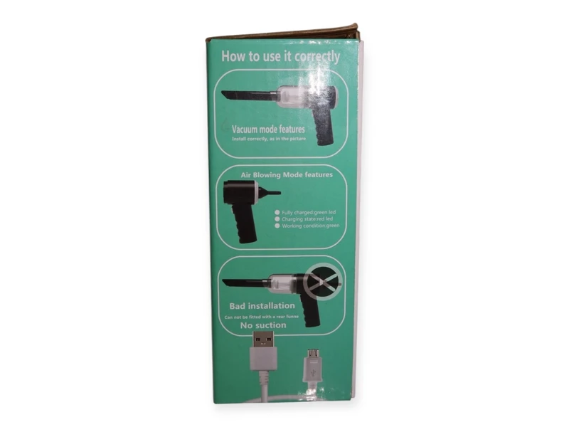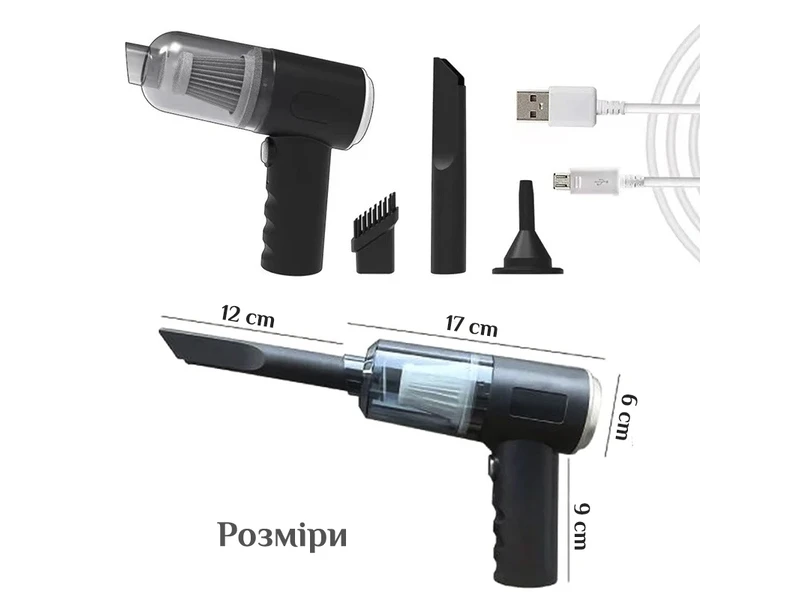 Поставляется в комплекте из трёх насадок и съемного фильтра, он станет незаменимым помощником в поддержании идеальной чистоты в салоне вашего автомобиля или в труднодоступных местах вашего дома.